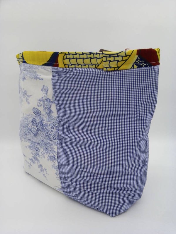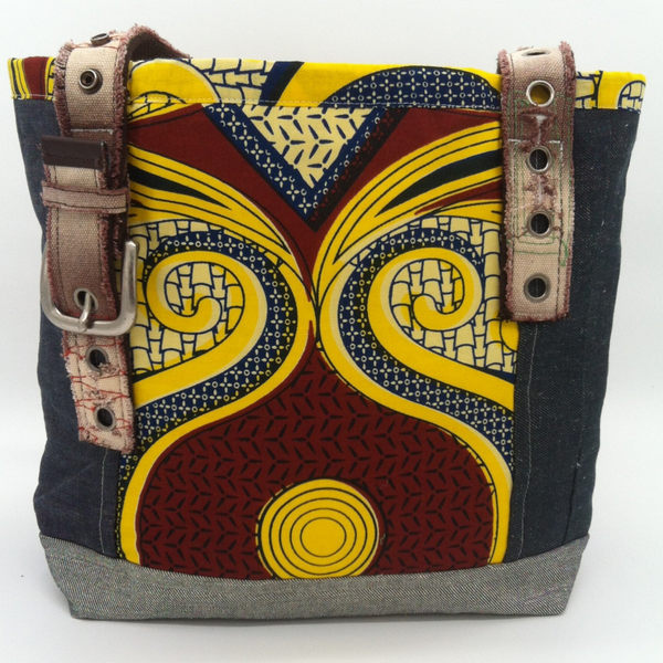 sac fait main à partir de jeans recyclés et de tissus imprimés